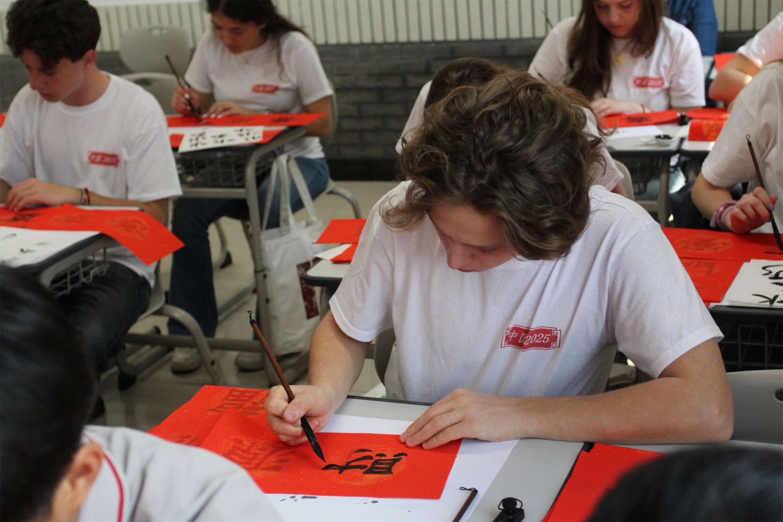 In the calligraphy class taught by Ms. Meng Li from the International Department, Ms.Li showcased the charm of Chinese calligraphy the charm of Chinese calligraphy to the Italian students. She introduced the basic knowledge of the Four Treasures of the Study (brush, ink, paper and inkstone), the five major Chinese calligraphic scripts (seal script, clerical script, regular script, running script and cursive script), the foundational techniques of calligraphy (the "Eight Principles of Yong"), as well as the significance of Spring Festival couplets. She also led them to personally copy Spring Festival couplets in clerical script, allowing them to appreciate the beauty of Chinese characters through ink, brush, paper, and inkstone. Before the class began, Italian students interacted enthusiastically with international students from the international department and introduced themselves to each other. Learning that an Indonesian student was about to have a birthday, everyone sang the birthday song for him together to celebrate his birthday.