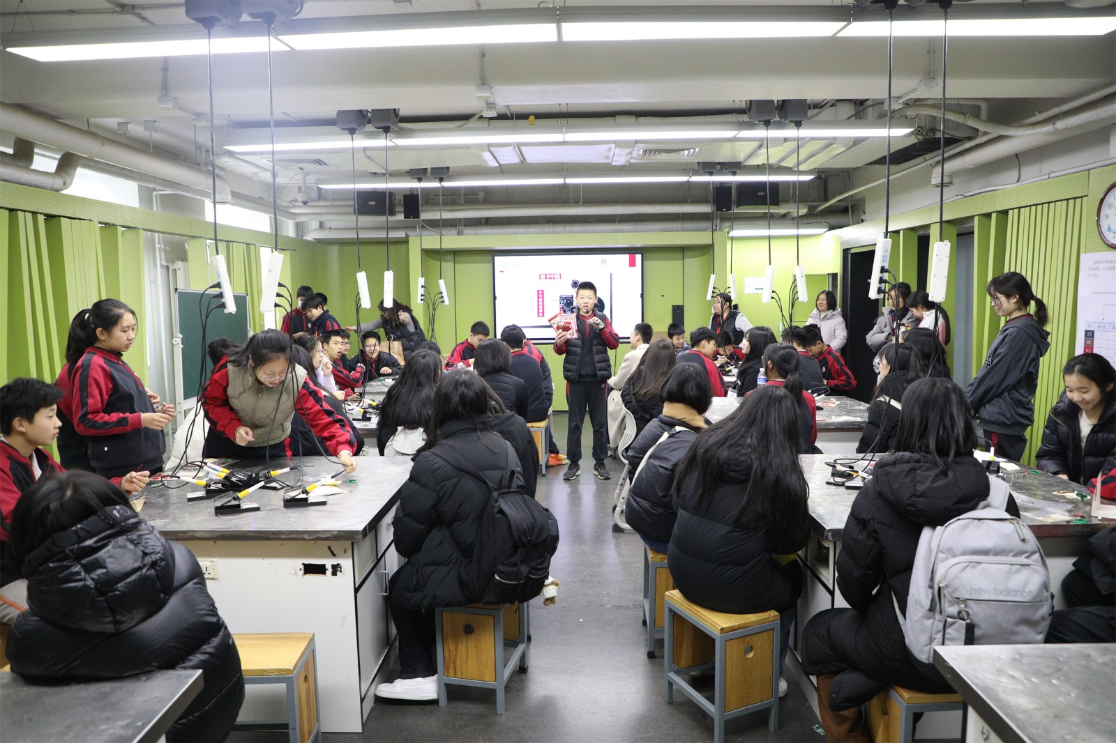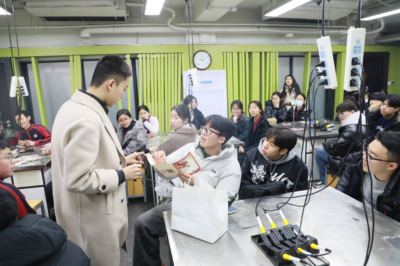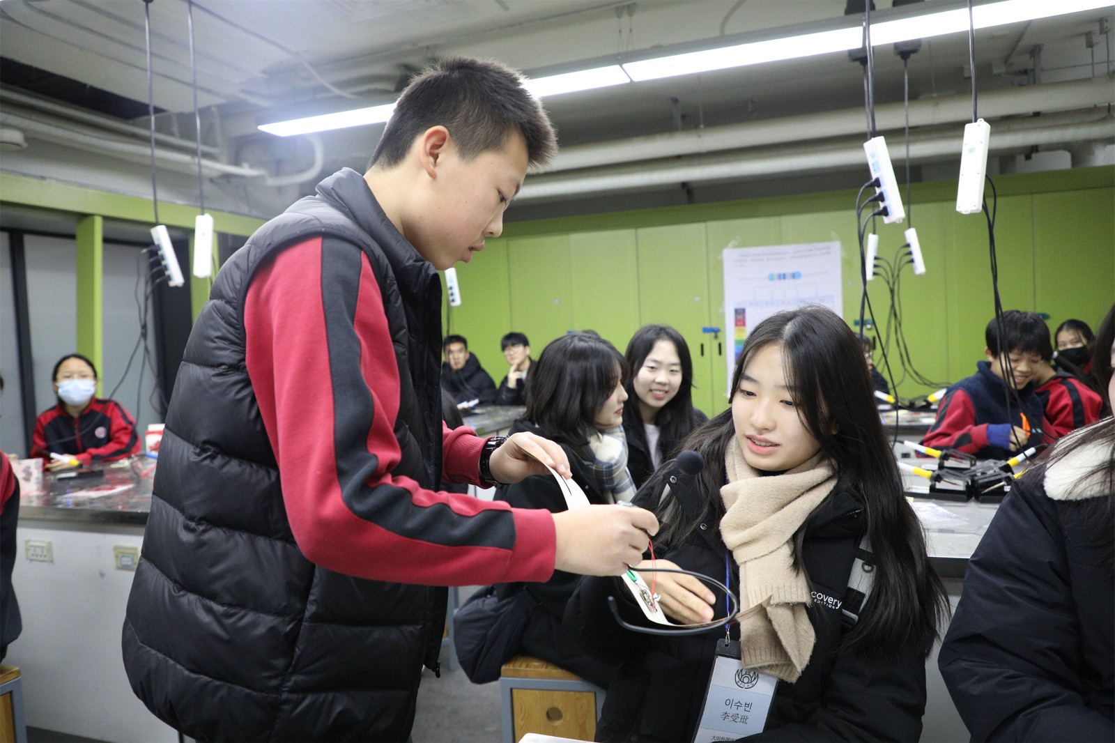 They then visited the Science and Technology Innovation Laboratory, where Teacher Zhang Cheng led them to experience the process of producing electronic recording greeting cards alongside Chinese students.