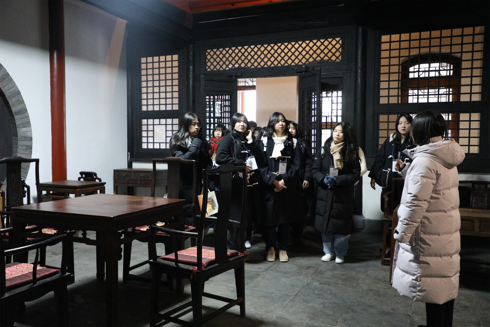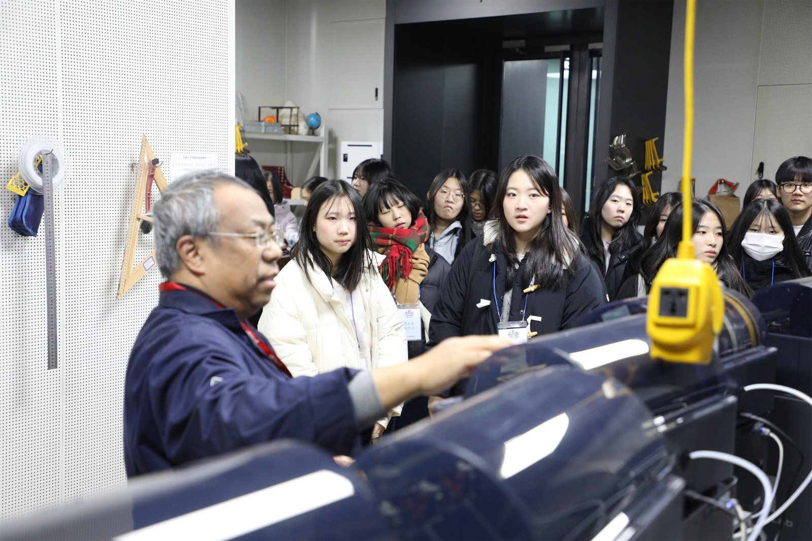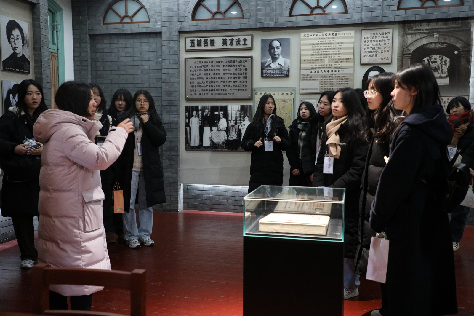 Subsequently, led by Deputy Director Yu Yuefang and teachers Li Meng and Pu Tianbo, the Korean delegation toured the East Campus, visiting the Xingtan (Apricot Altar), Science and Technology Innovation Laboratory, greenhouse, art classroom, music classroom, Qian Xuesen Memorial Hall, and Sanwei Bookstore.