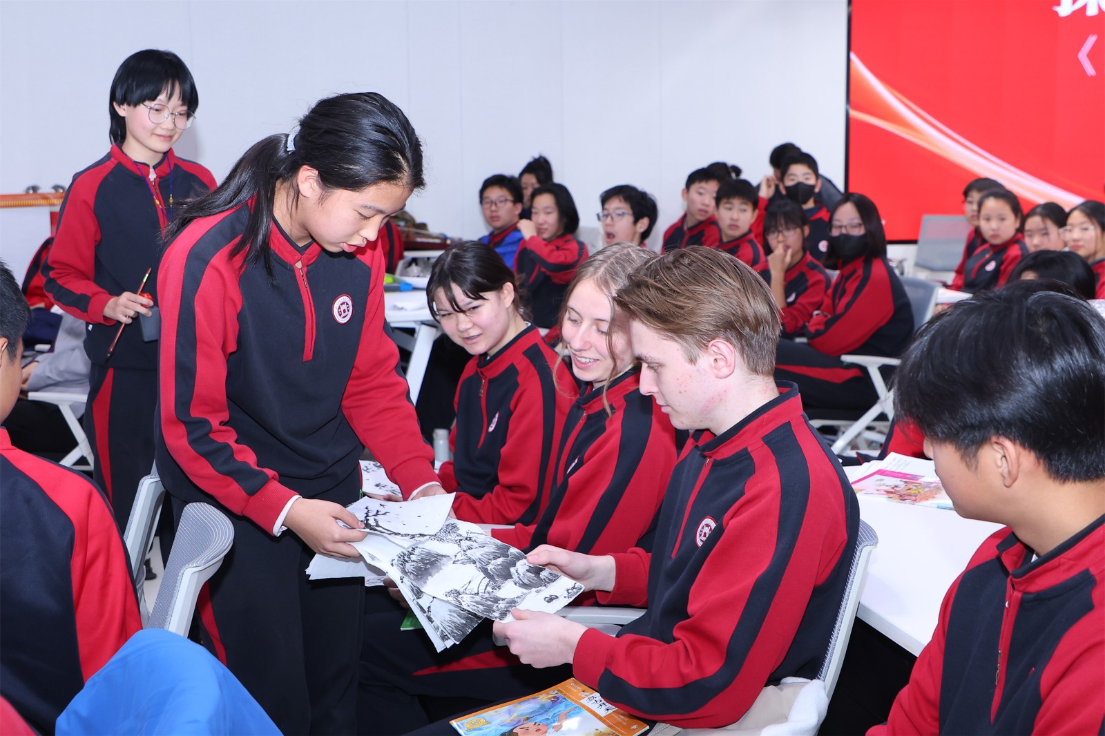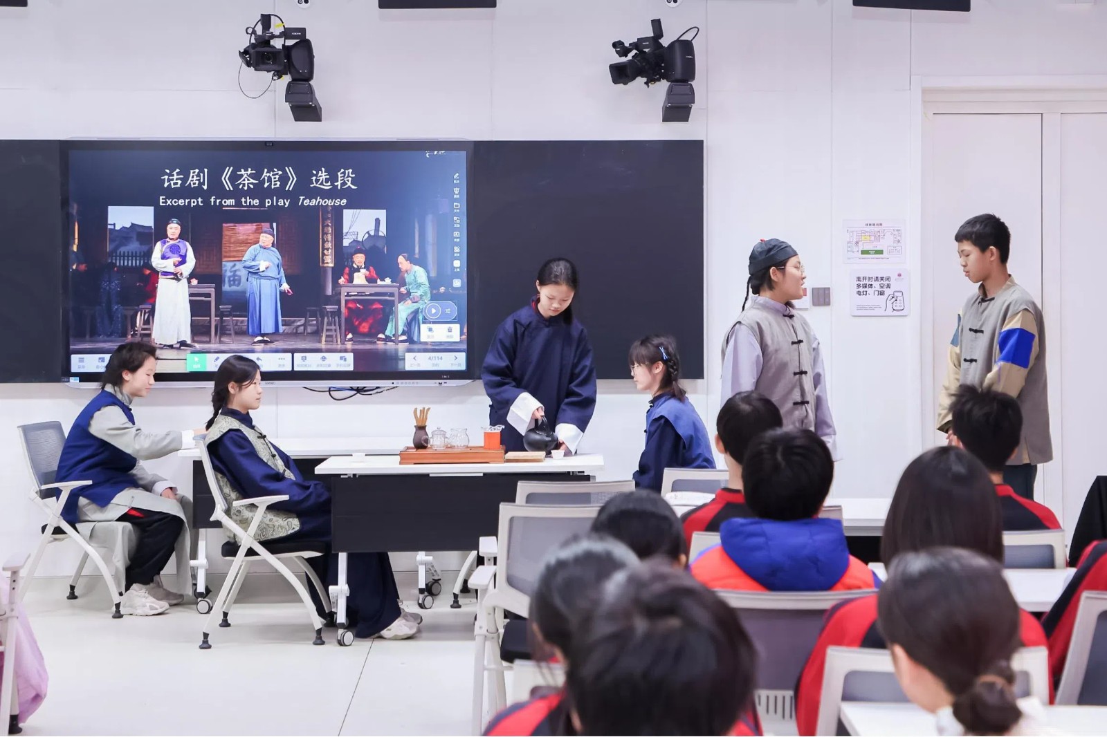 Under the theme of "Exploring New Paths for High-Quality Classroom Teaching", this event was distinctive. Teacher Li Boshu Jie, the head of the International Department's teaching and research group, inspired by the "Lao She Tea-house" unit in the eighth-grade English textbook, guided the second-year junior high school students and international students to conduct independent exploration and project-based learning. The event concluded with a presentation and exchange, presenting a visual and auditory feast. The second-year junior high school students, combining what they had learned in and out of class, showcased a variety of themes including an introduction to Lao She's life, excerpts from the play "Teahouse", tea culture displays, guzheng performances, Peking Opera art, Kunqu Opera elegance, ethnic dances, calligraphy art, and Chinese painting. They also actively invited international students to participate in interactive sessions such as learning to sing Peking Opera, play the guzheng, and dance Chinese dances. The international students also presented wonderful displays of Indonesian tea culture, German tea culture, and a selection from the shadow play "Journey to the West - Three Battles with the White-Boned Demon", demonstrating their love and understanding of Chinese traditional culture.